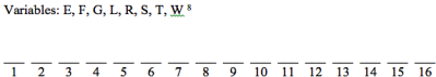 Because the 16 hours are fixed, they are in a fixed line above. Each slot represents one hour. The variables are represented by the first letter of the activity to be completed. You can figure out the assignments of each variable to the 16 slots using a series of conditional statements, or rules, that you determine to be true.